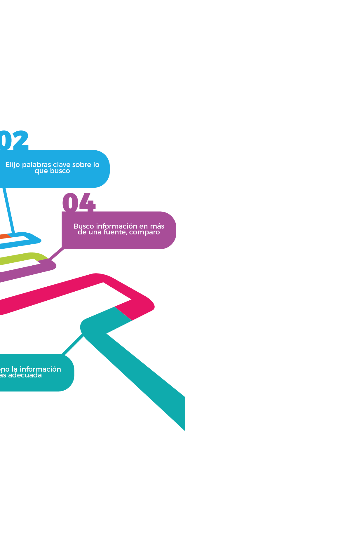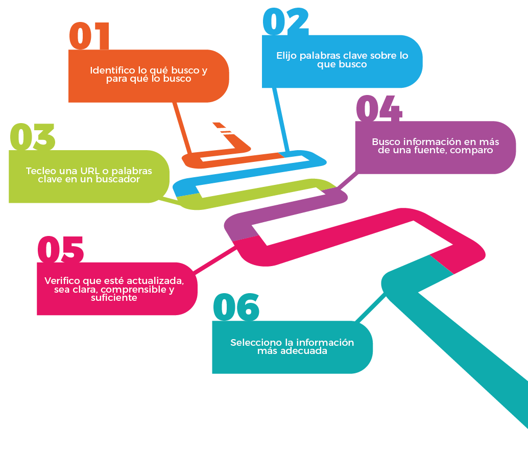 Para ejercer este derecho de forma efectiva y no perdernos ante la gran cantidad de información que circula en internet, necesitamos desarrollar una serie de conocimientos y habilidades para el uso de herramientas tecnológicas y seguir una serie de pasos que nos ayuden a identificar el tipo, nivel de precisión y calidad de la información a buscar y encontrar.